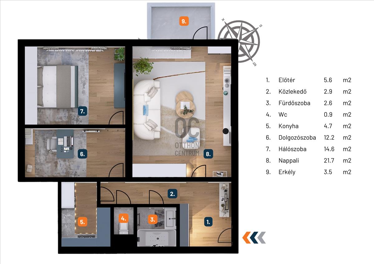 ✅ Külön konyhás elrendezés, jól szeparálható háló- és dolgozórész, ideális családoknak, otthonról dolgozóknak is.