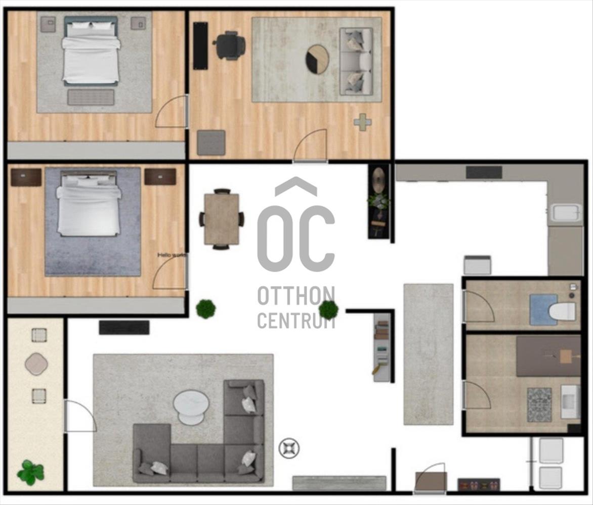 Helyiségek: szobák: 10, 5 m2, 7, 2 m2, 8, 9 m2; nappali-étkező: 24, 4 m2; konyha: 5, 7 m2, fürdő: 4 m2, wc: 1 m2, közlekedő: 5, 2 m2, erkély: 4 m2.