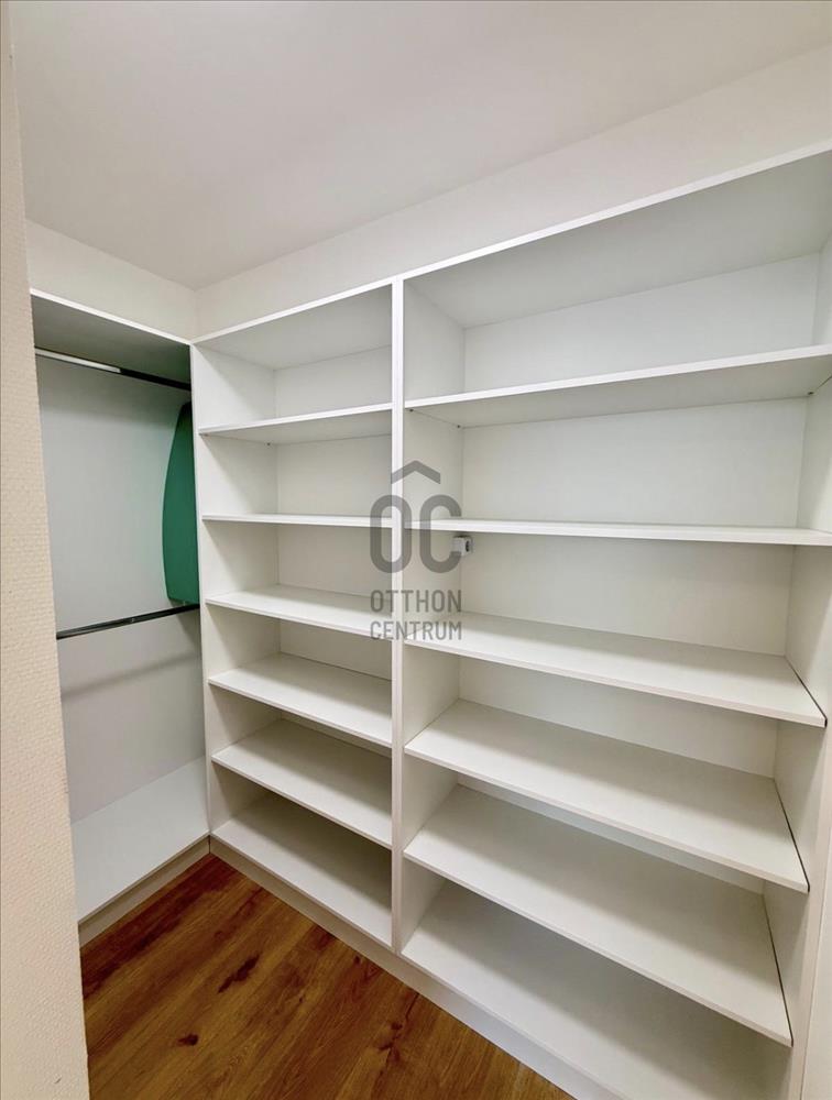 A gardróbszobában szintén egyedi, méretre gyártott gardróbszekrény található, amely hatalmas tárolókapacitást biztosít.