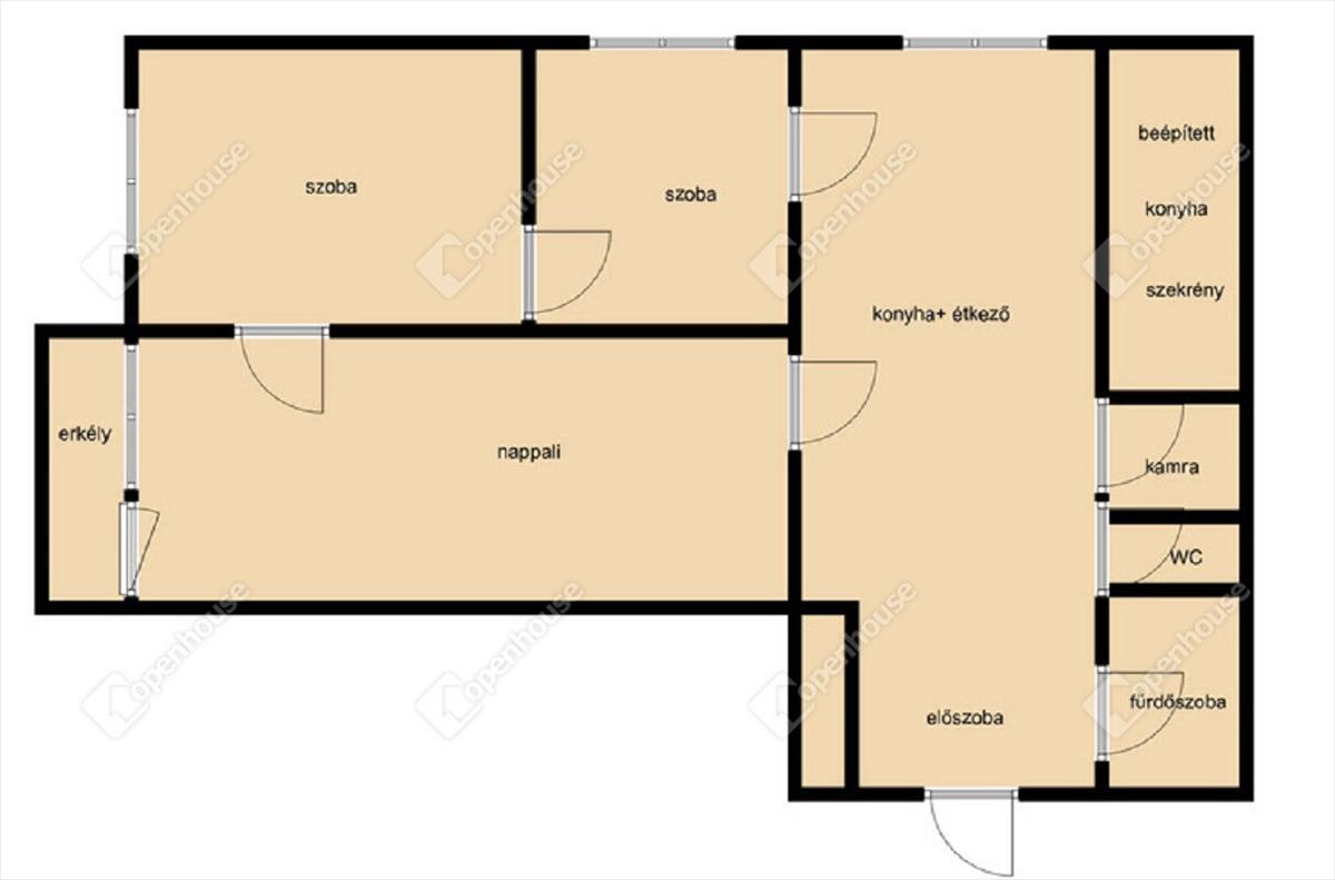 - a lakásban egy nappali, két szoba, étkező konyha egy légtérben, kamra, előszoba, fürdőszoba wc külön helységben található.
