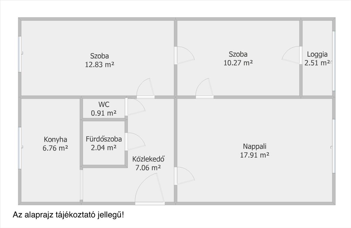 - Konyha + étkező, nappali, 2 hálószoba, fürdőszoba, wc, közlekedő, beépített loggia.