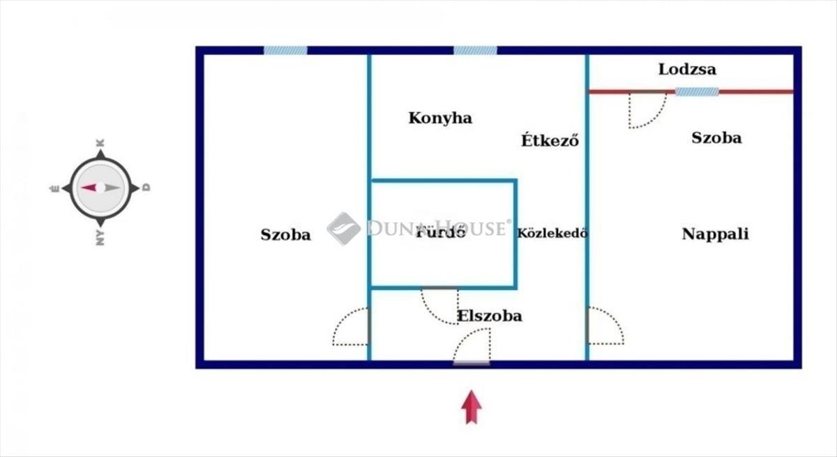 nappali–szoba, konyha–étkező, előszoba, közlekedő, hálószoba, fürdőszoba–WC, valamint lodzsa-erkély.
