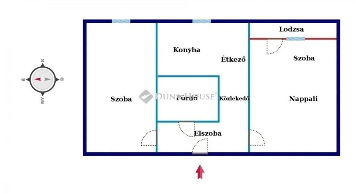 - nappali - szoba, konyha - étkező, előszoba, közlekedő, szoba, fürdőszoba - WC