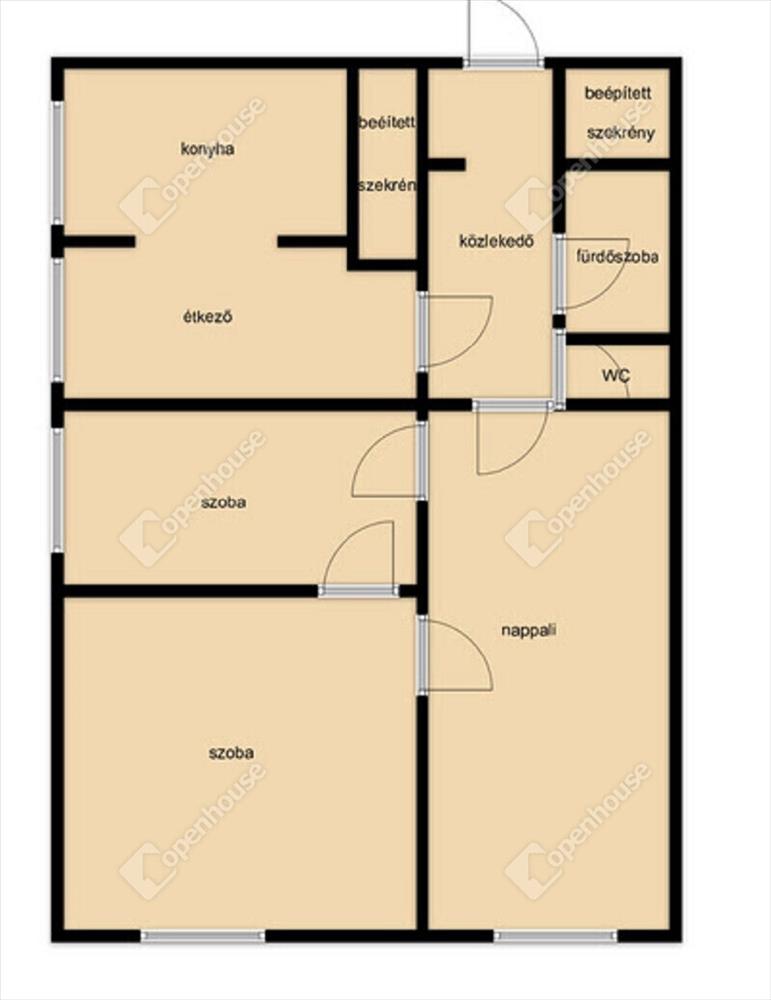 - a lakásban egy nappali, kettő szoba, konyha étkező egy légtérben, közlekedő, fürdőszoba, wc külön helység található.