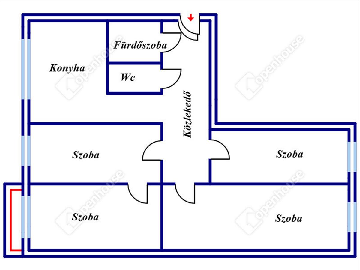 A lakásba belépve egy tágas közlekedő fogad. Innen nyílik minden helyiség külön bejáratokkal. Nevezetesen a fürdőszoba, egy wc, az étkezős konyha valamint a négy szoba.