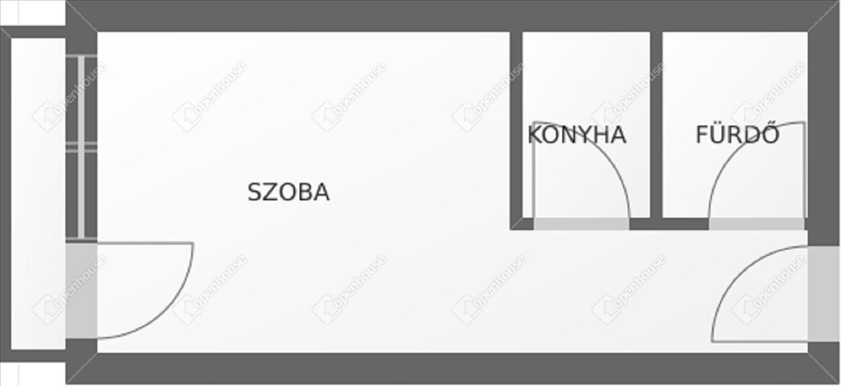 A helyiségek elosztása: szoba, konyha, fürdőszoba és előtér.