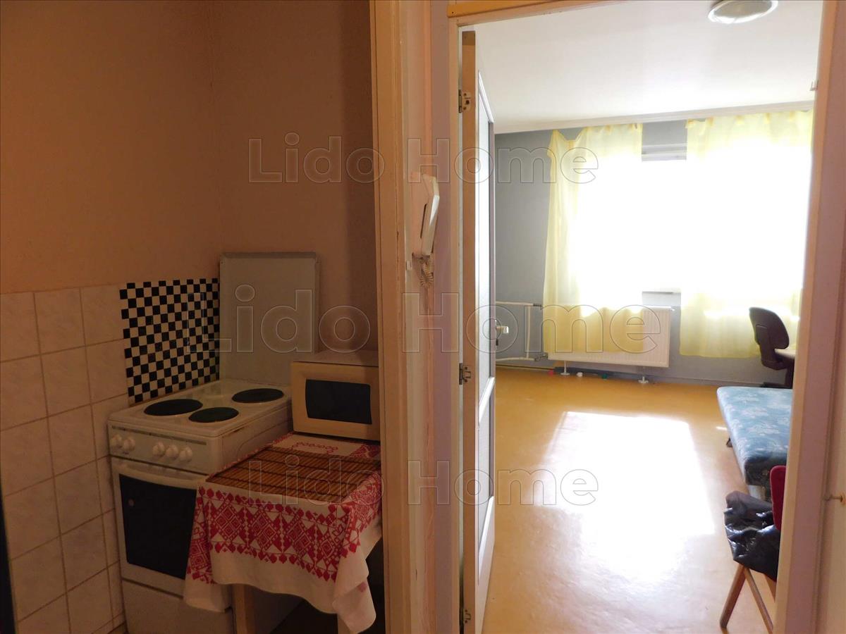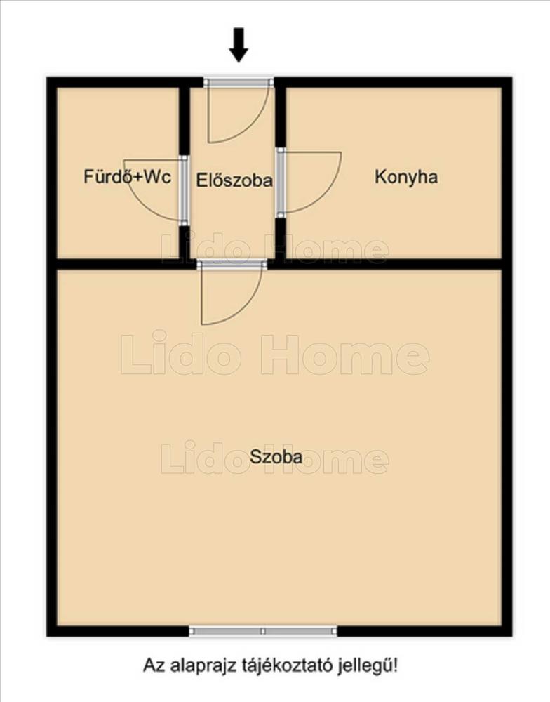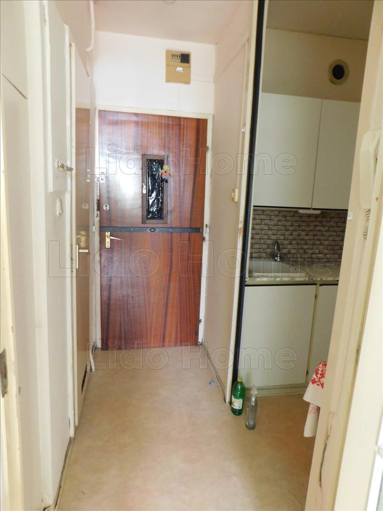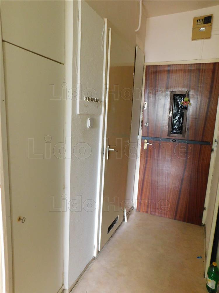 A lakásba belépve az előszobába lépünk, jobbra a fürdő+wc található, balra a konyha, szemben pedig a szoba, melyben elhelyezésre került egy beépített szekrény.