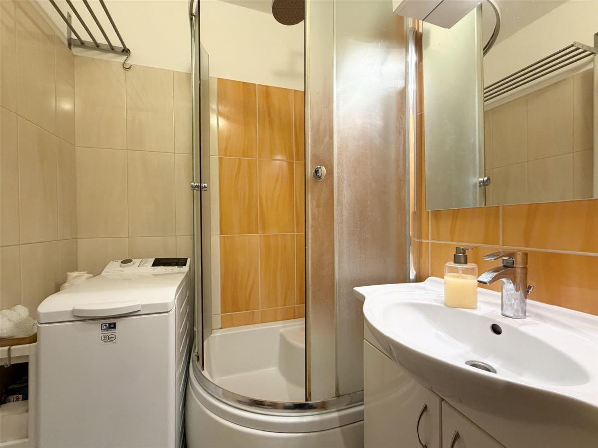 A fürdőben zuhanykabin, törölköző szárítós radiátor