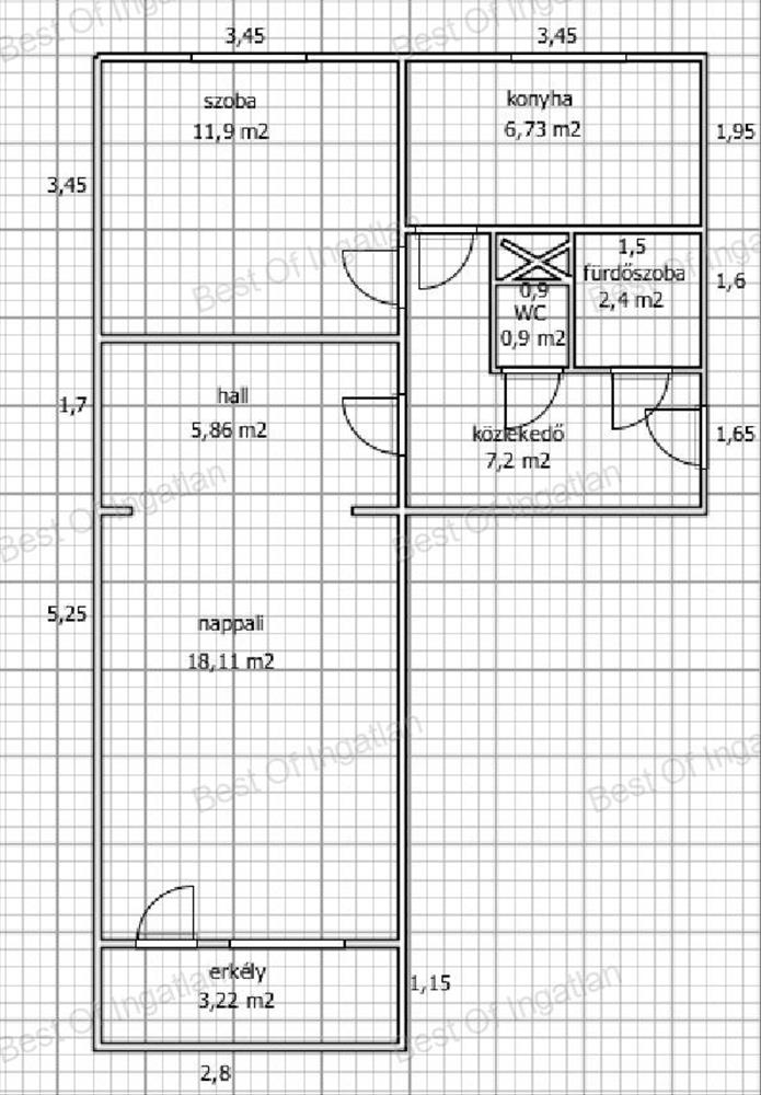 A tehermentes lakás 55 m2-es, 2 szoba hallos + erkélyes.