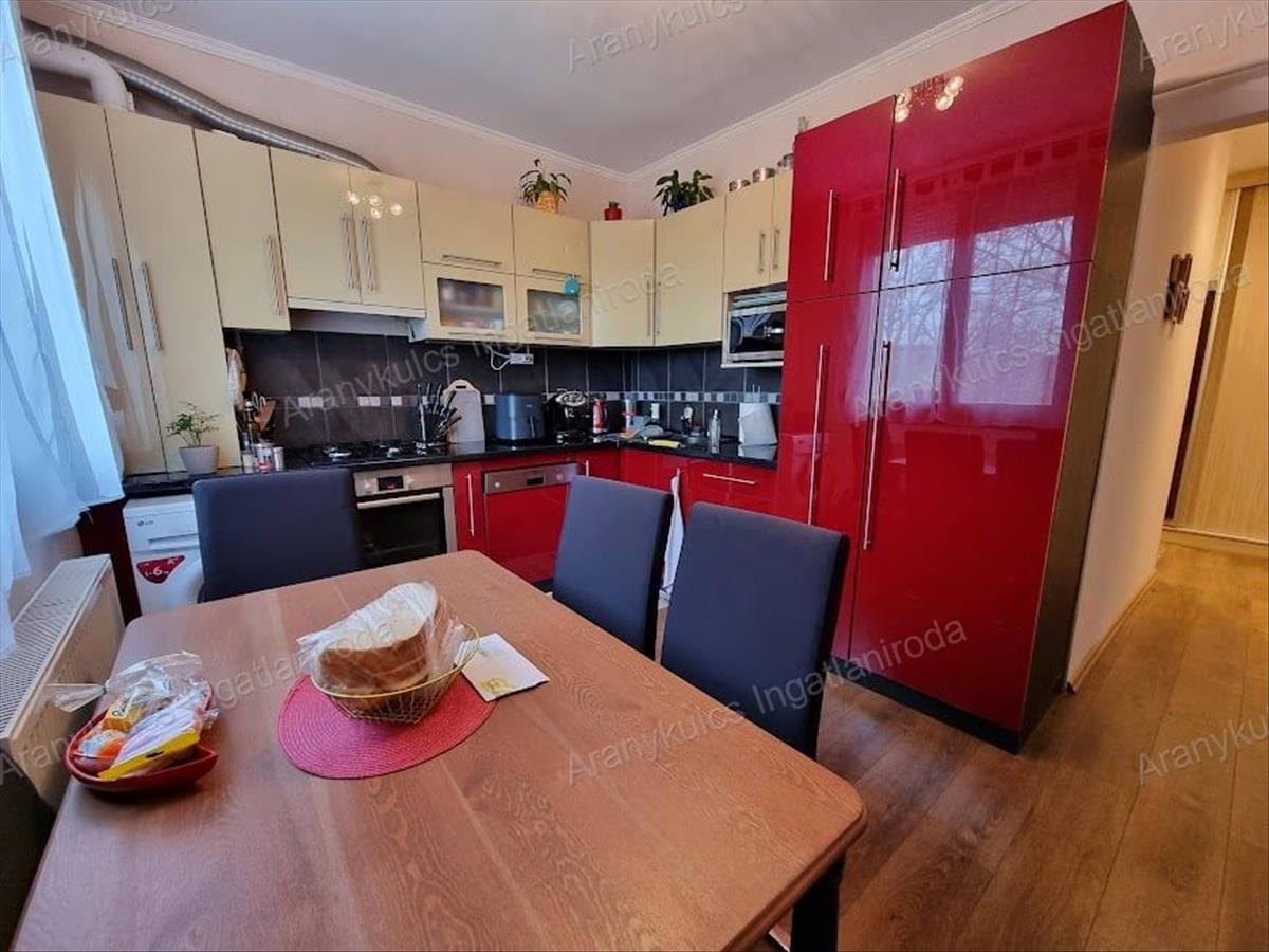 A tágas, hatalmas konyha kényelmes teret biztosít a mindennapi főzéshez és étkezéshez. a lakásban több praktikus beépített bútor is található, amelyek növelik a tárolási lehetőségeket és a lakás kényelmét.