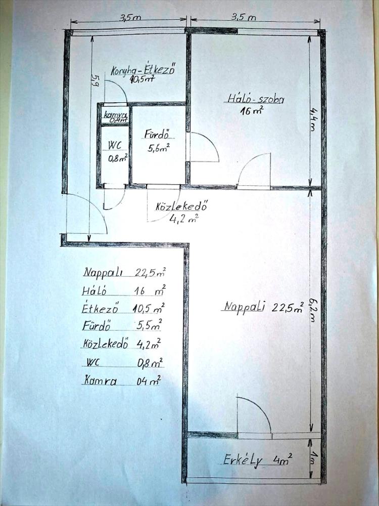 nappali 22, 5m2, közlekedő 4, 2m2, szoba 16m2, fürdőszoba 5, 6m2, konyha-étkező 10, 5m2, wc 0, 8m2, kamra 0, 4m2, erkély 4m2;