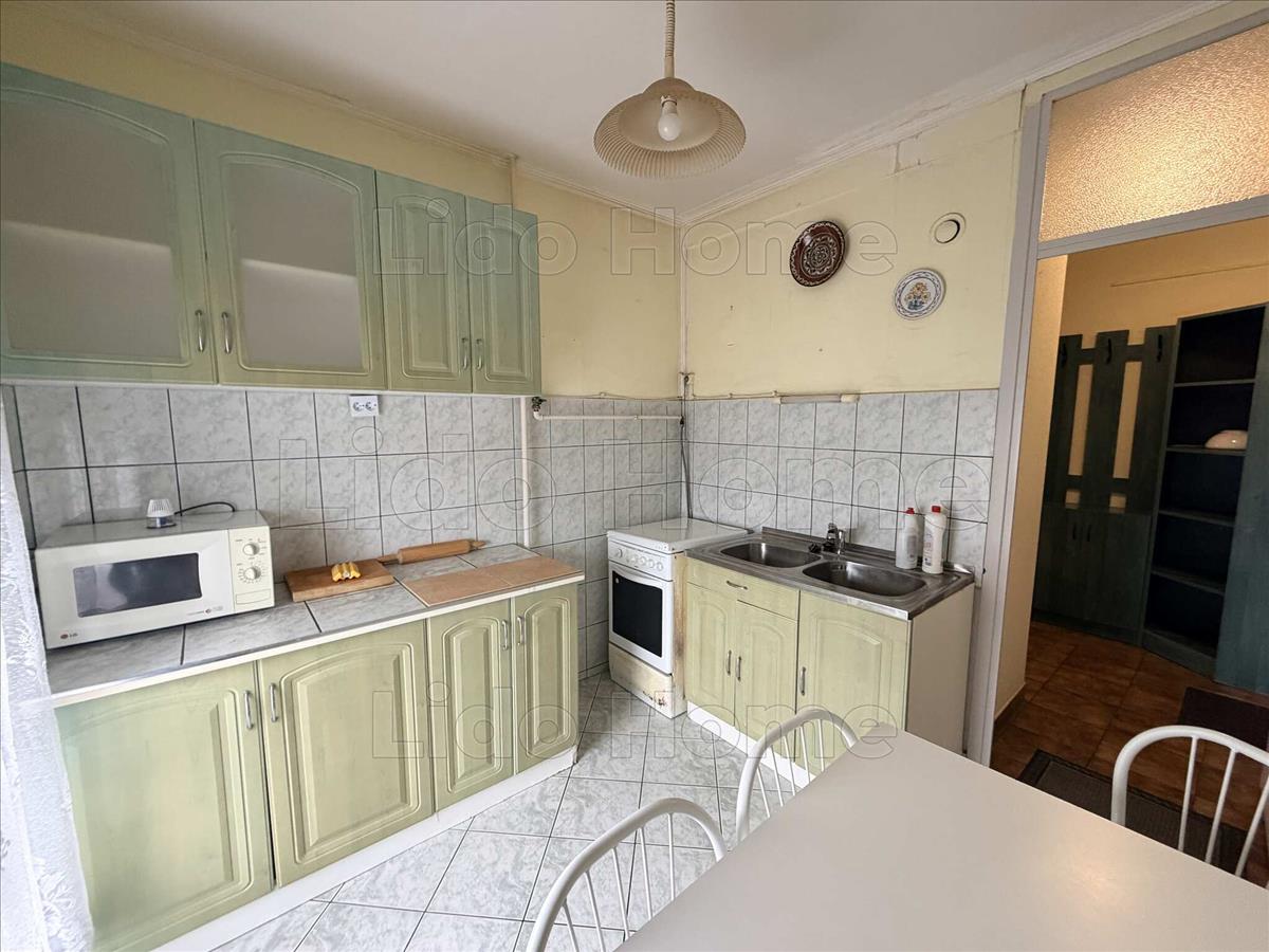 A lakás elosztása 2 szoba, konyha étkezővel, közlekedő, fürdőszoba, wc.