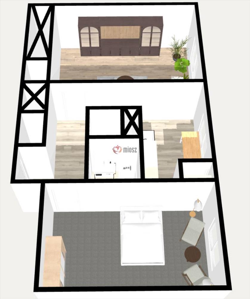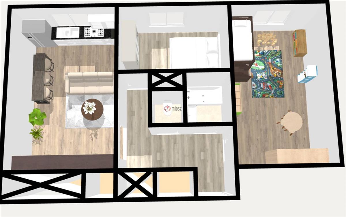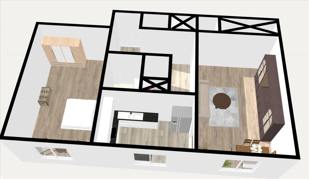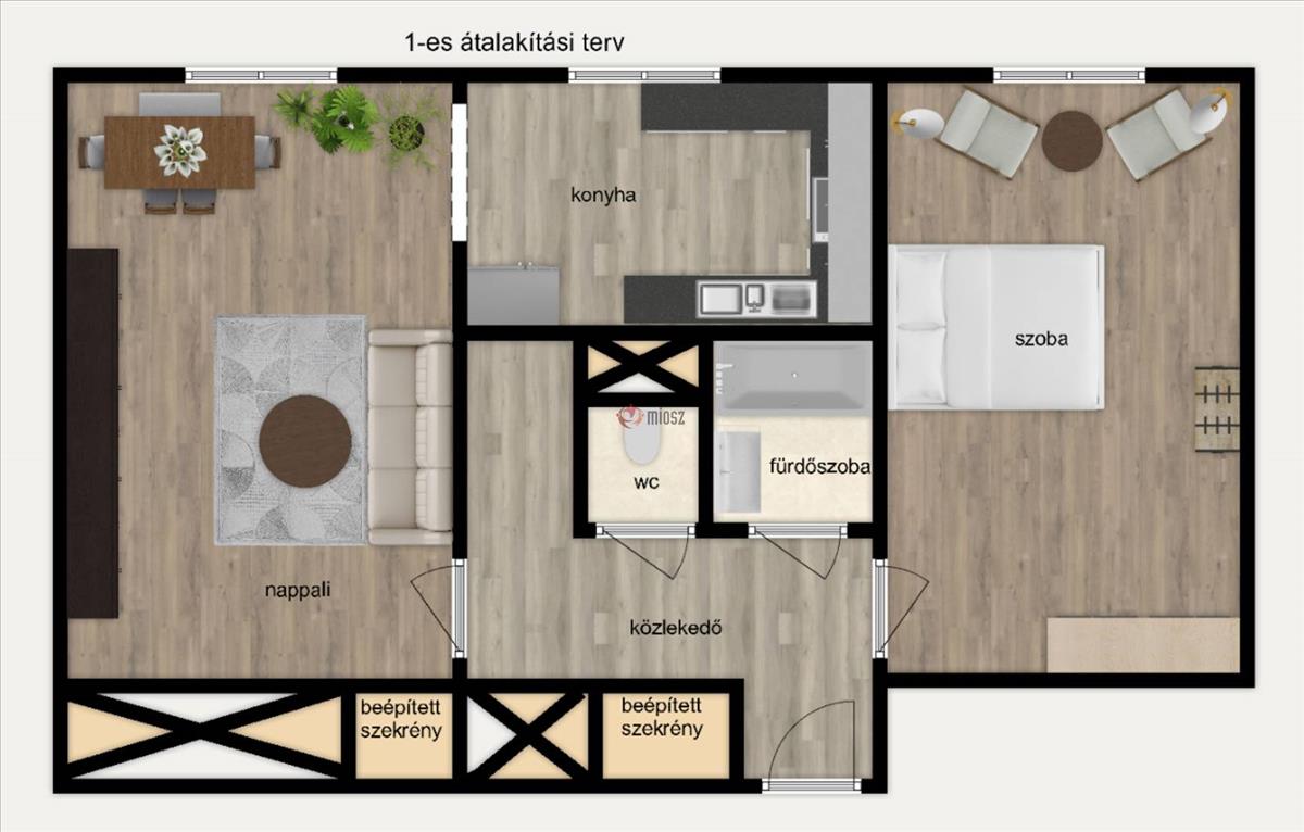 A két szoba tágas és jól berendezhető: a kisebbikben szőnyegpadló, a nagyobbikban laminált burkolat található. a konyhabútor modern, fiatalos megjelenésű, megkímélt állapotú – azonnal használható. (Fényképek között átalakítási tervek is találhatók)