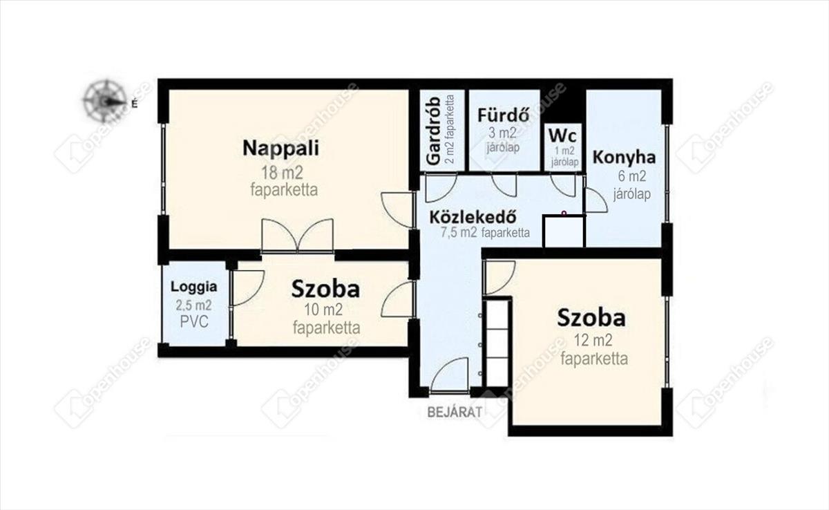 - a szobákban, közlekedőben és a tárolóban parketta, a többi helyiségben járólap található