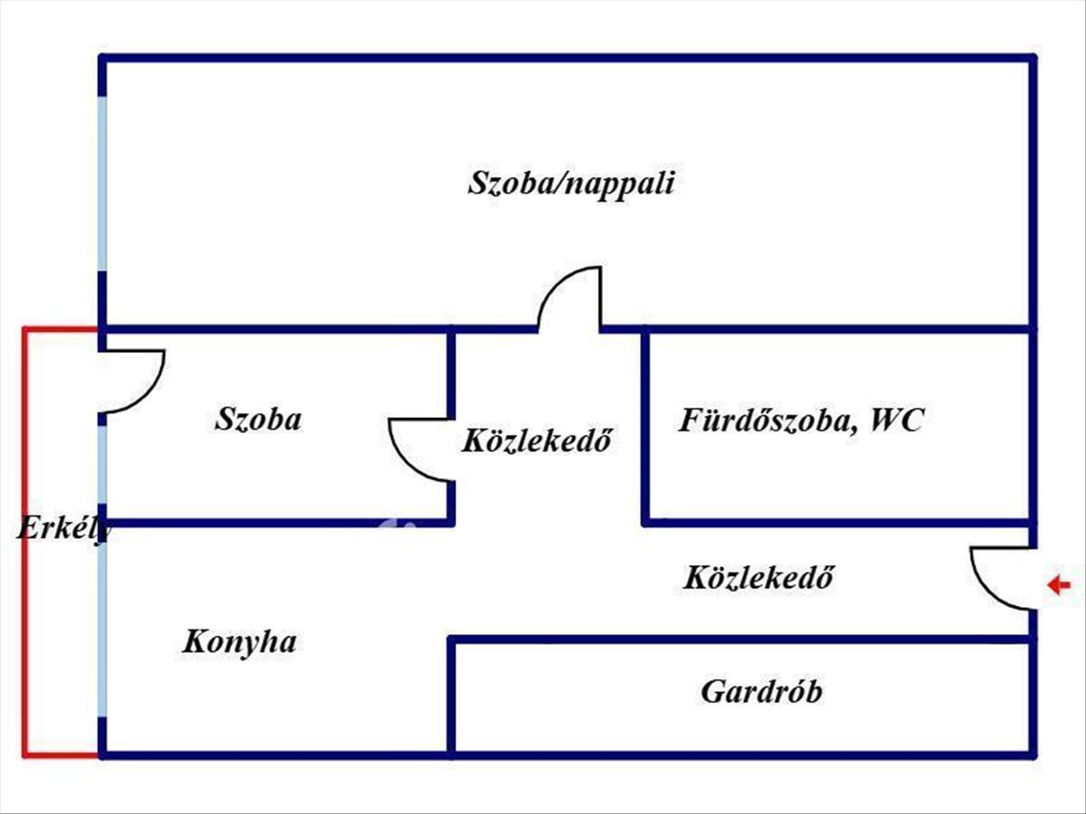 Elrendezés: külön nyíló 2 szoba, konyha, fürdőszoba-WC egyben, erkély.