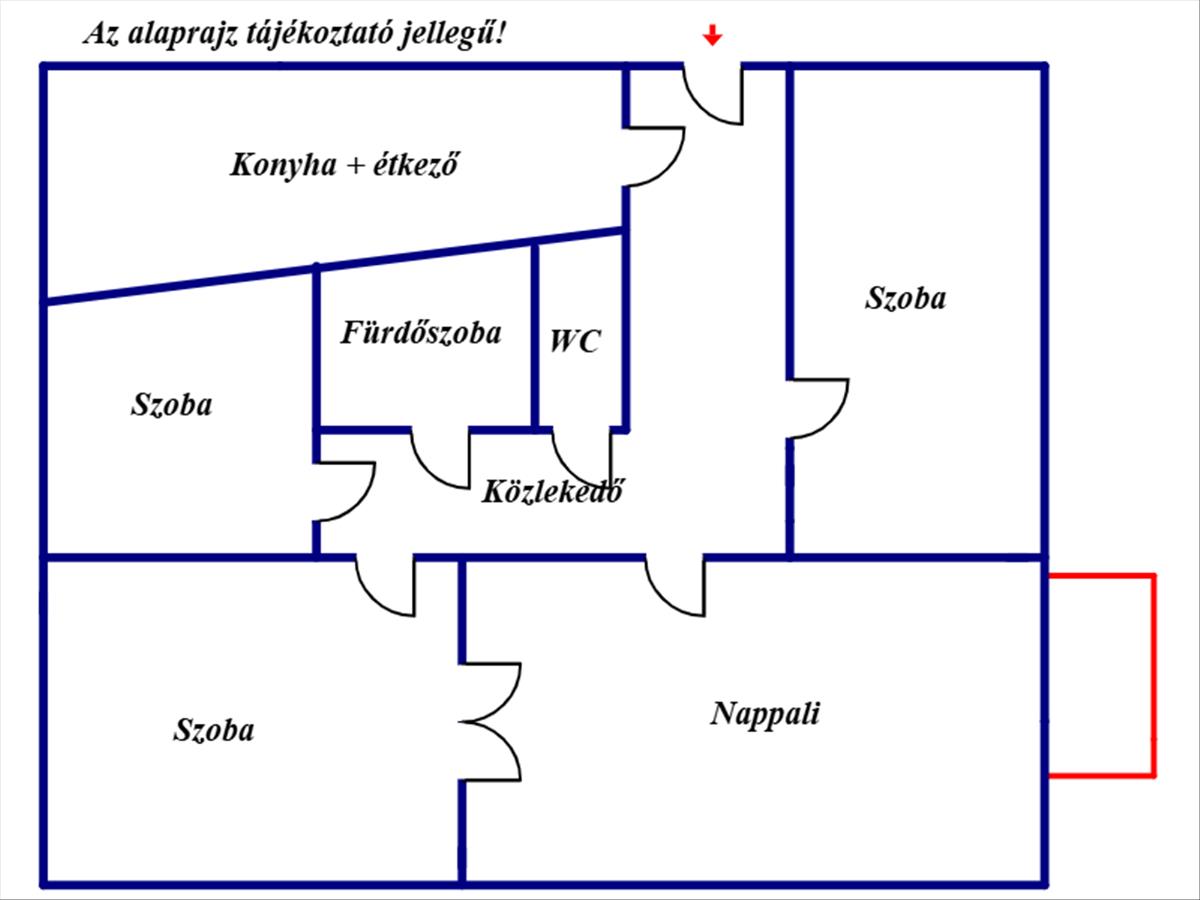 Élettér: 3 szoba, nappali, közlekedő, konyha + étkező, fürdőszoba, wc, erkély (3 m2).