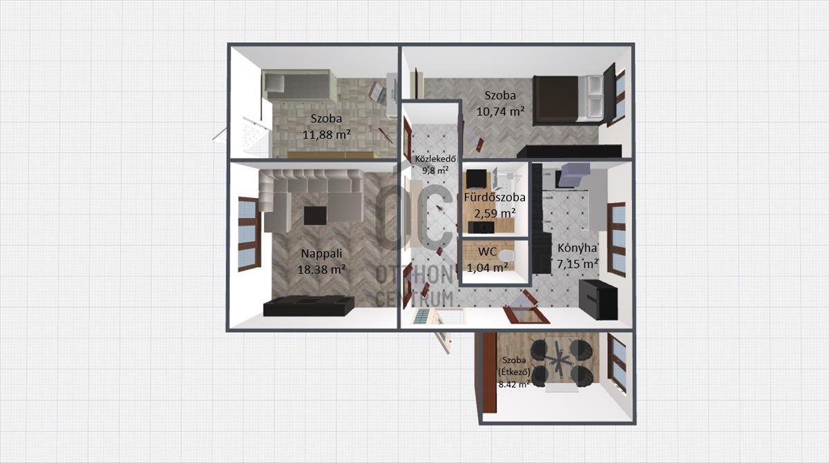 A lakás elrendezése kifejezetten élhető: 4 különálló szoba, így minden családtagnak jut saját tér.
