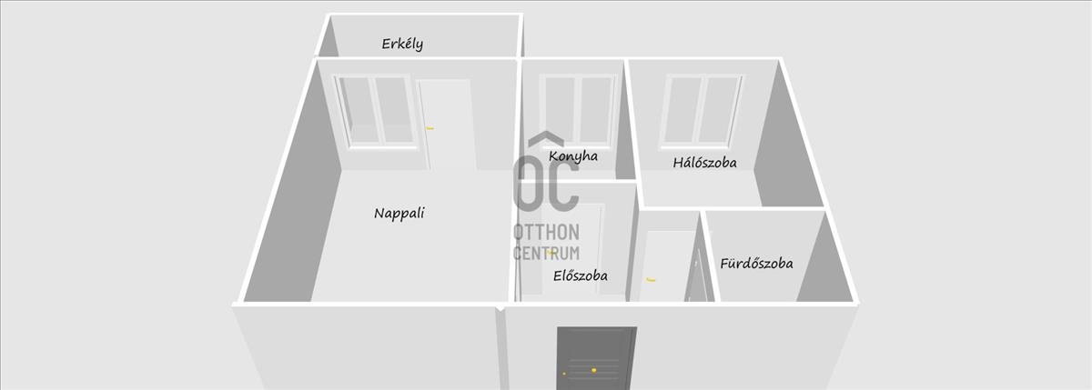 Helyiségek: előszoba, konyha, fürdőszoba (kád) + wc, 2 szoba