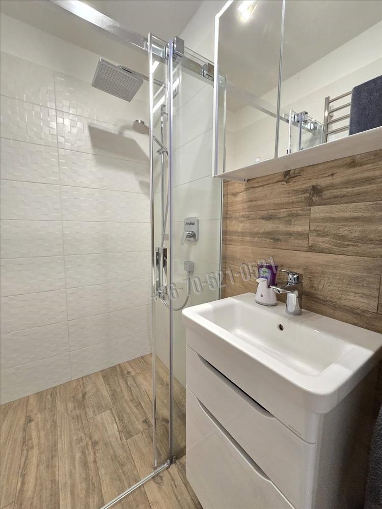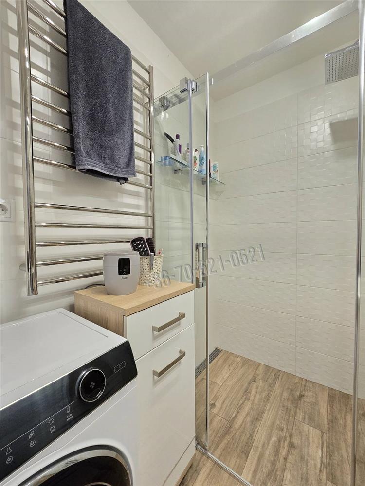 A fürdőszobában zuhanyzó került kialaktásra, mely tolóajtóval rendelkezik, valamint egy elektromos, törölközőszárítós radiátor is felszerelésre került.