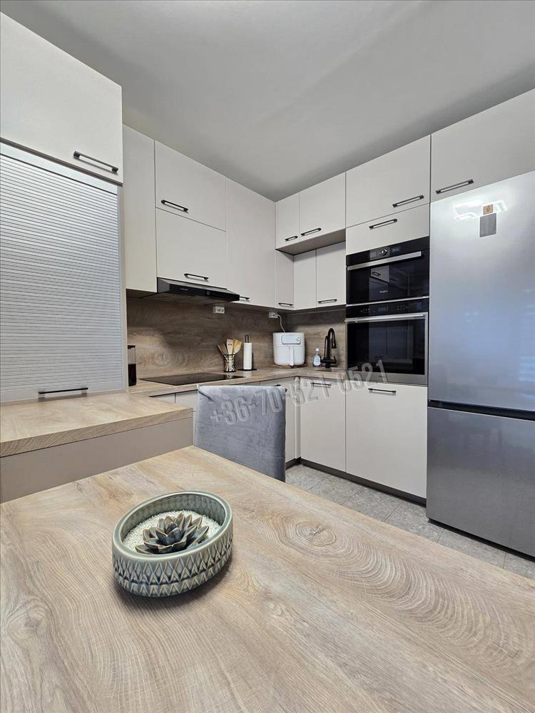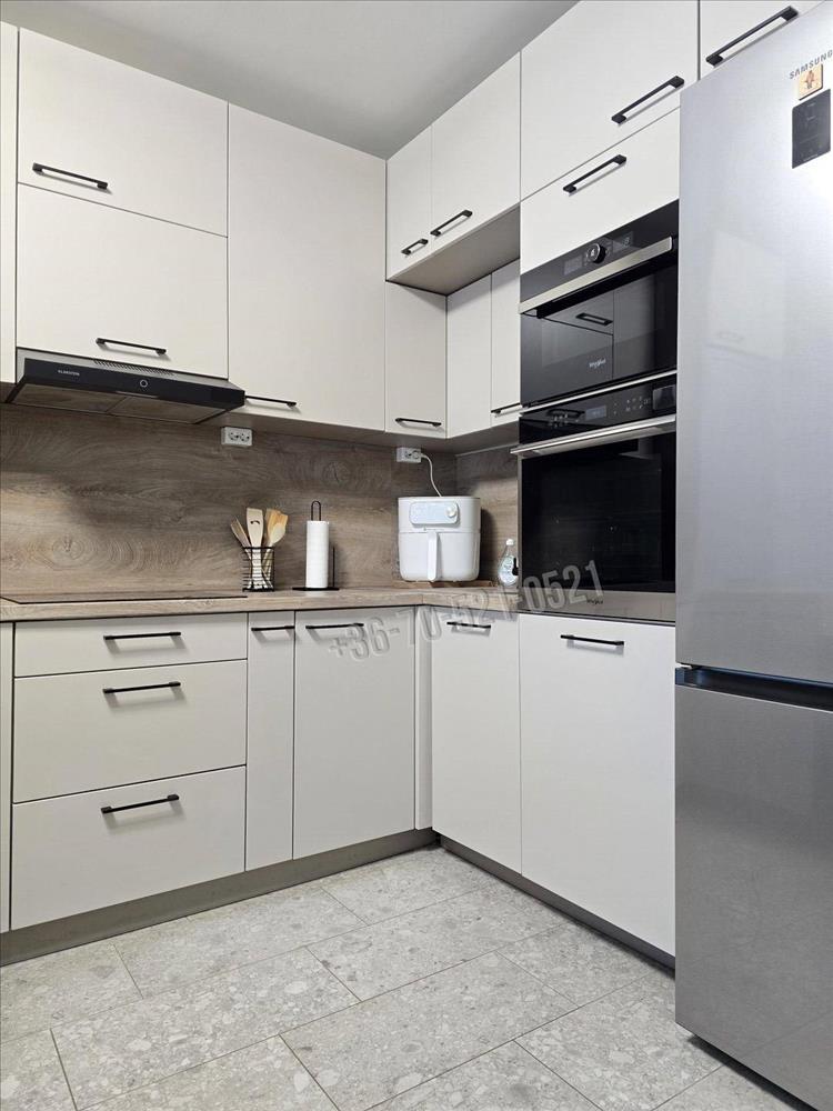 Konyhája, minden igényt kielégítve, praktikusan lett kialakítva. a sütő, mikró elérhető magasságban. Konyhabútorba rejtett, redőnyös tároló, beépített vízszűrő, szagelszívó, indukciós főzőlap, és mosogatógép is beszerelésre került.