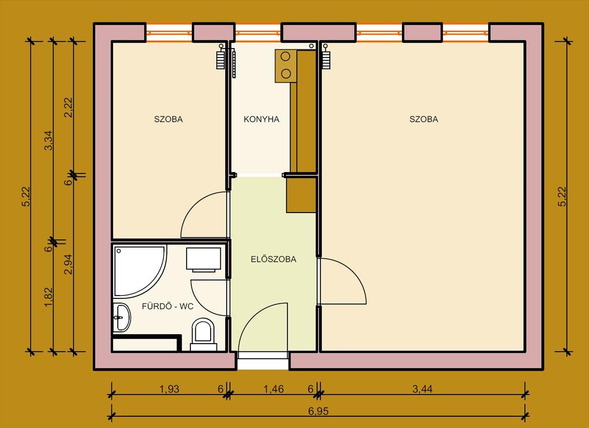 Előszoba, Szoba, Félszoba, Konyha, Fürdő+Wc