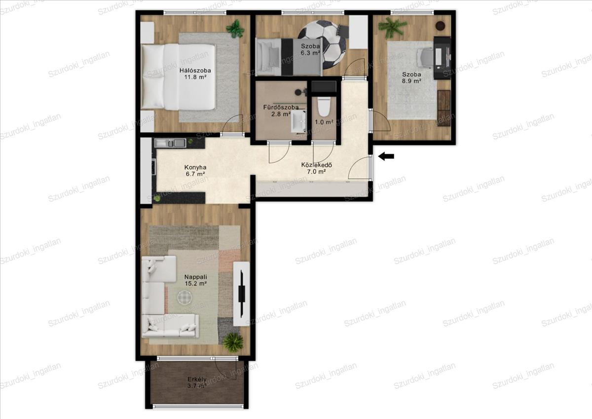 Elosztás: amerikai konyhás nappali + 3 különnyíló szoba
