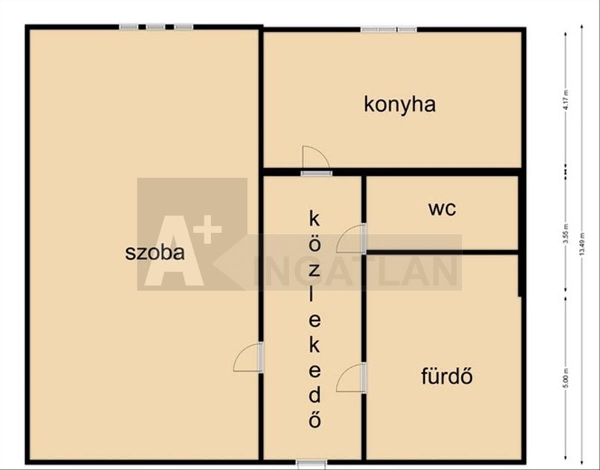 A lakás elrendezése :egy nagy szoba, kényelmes méretű konyha, külön fürdőszoba, wc.