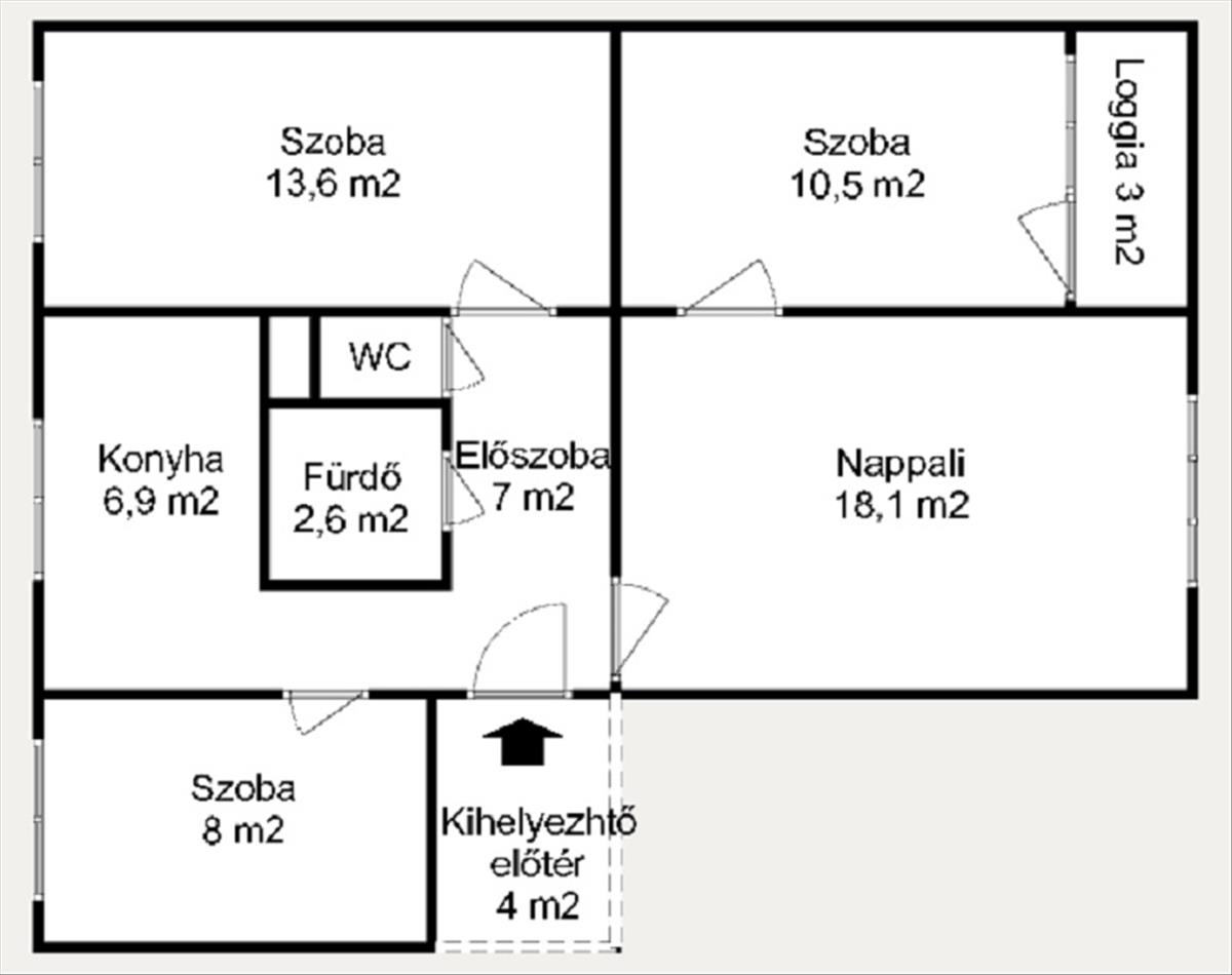 - Tájolás: a lakás hossztengelye é-d irányú, a nappali és az erkélyes háló D-re, a többi helyiség ablaka É-ra néz;
