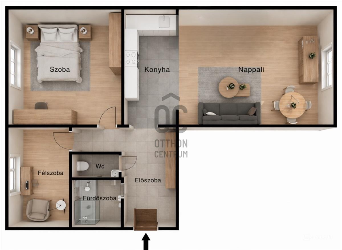 Székesfehérváron, a Belvárosban található ez a praktikusan átalakított lakás, amely eredetileg a klasszikus 2 szoba hallos volt. a tulajdonos a konyhát a hall részbe költöztette, így a nappalival egy légtérbe került. a konyha helyén egy félszoba lett kialakítva.