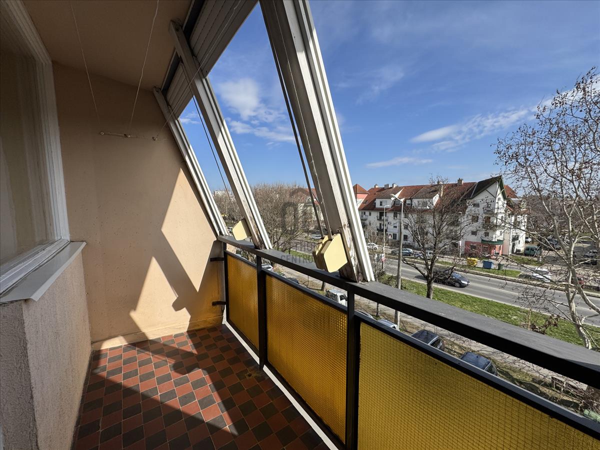 A keleti tájolású erkély redőnyökkel felszerelt.