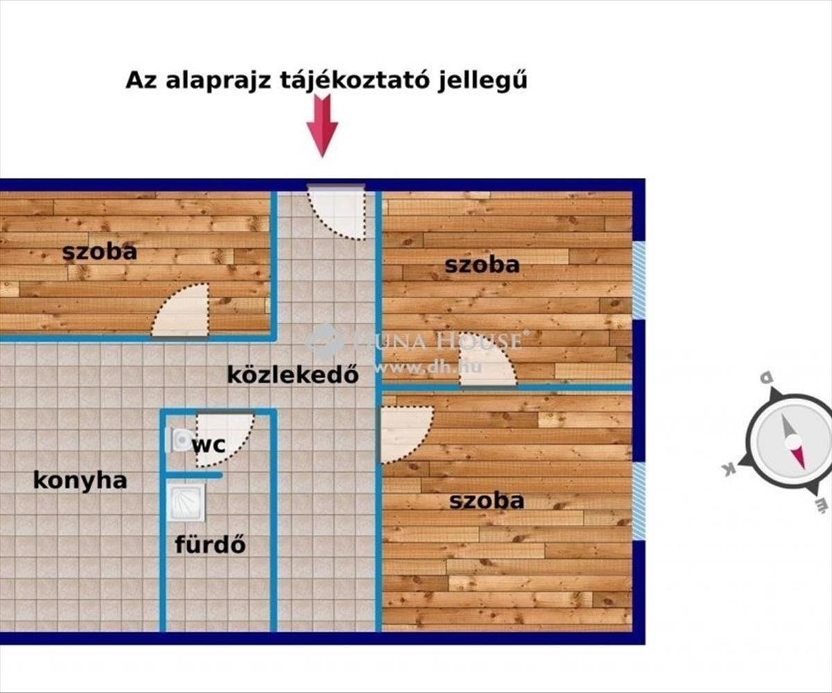 Szobákban parketta, míg a többi helyiségben járólap található.