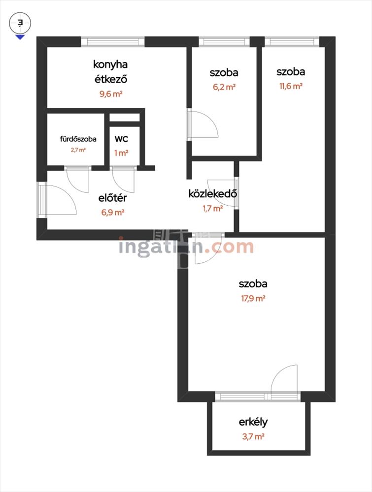 Elosztása: közlekedő/előtér 6, 91 m2, szoba 17, 91 m2, szoba 11, 61 m2, félszoba 6, 21 m2 konyha 9, 65 m2, fürdőszoba 2, 79 m2, toalett 1 m2, közlekedő. 1, 79 m2, erkély 4 m2