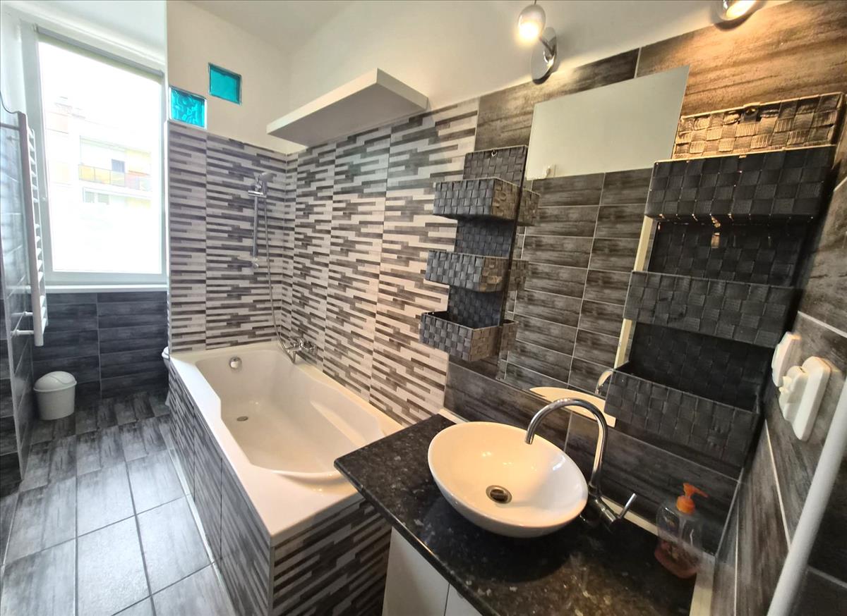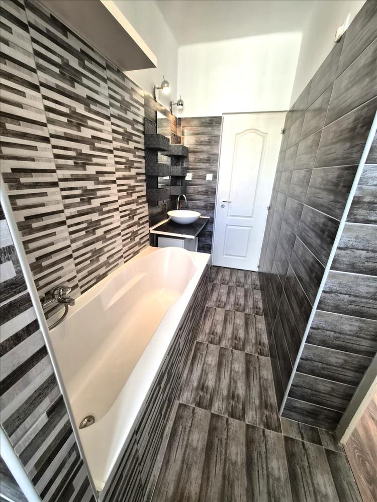 Tovább haladva bal oldalon egy hosszanti kialakítású, letisztult színvilágú fürdőszoba kapott helyet, amely a mellékhelyiséggel egy légtérben került kialakításra. Innen nyílik a másik szoba, ami rendkívül világos.