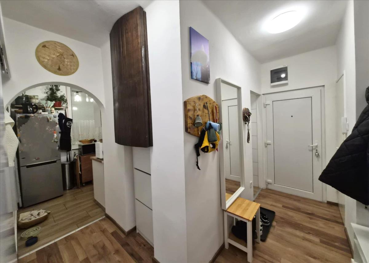 A bejárati ajtón belépve egy tágas, világos közlekedőbe érkezünk. Jobbra található a fürdőszoba, balra külön helyiségben a mellékhelyiség. Tovább haladva bal oldalon egy praktikus kamra kapott helyet, amely ideális a háztartási eszközök és élelmiszerek tárolására. a közlekedő végén a nappali nyílik meg előttünk, ahonnan egy közel 4nm-es erkélyre léphetünk ki, ahonnan szép, nyugodt kilátás tárul elénk. Az eladó lakás másik szobája jelenleg hálószobaként funkcionál, míg egy hangulatos boltíves átjárón keresztül jutunk el a tágas konyhába. a konyhabútor egyedi tervezés alapján, asztalos által készített, minőségi anyagokból, teljes gépesítéssel, amely a vételár részét képezheti megbeszélés szerint.