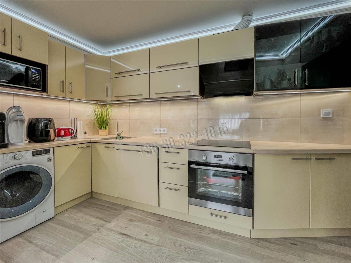 A 2022-ben beszerelt, egyedi tervezésű, kiváló minőségű konyhabútort, magasfényű beige előlapokkal. a beépített konyha teljes mértékben gépesített, magában foglalja a Whirlpool 13 terítékes mosogatógépet, Electroluxkerámia főzőlapot és sütőt, a kivezetett Gorenje páraelszívót, valamint a Wi-Fi-s lg mosógépet.