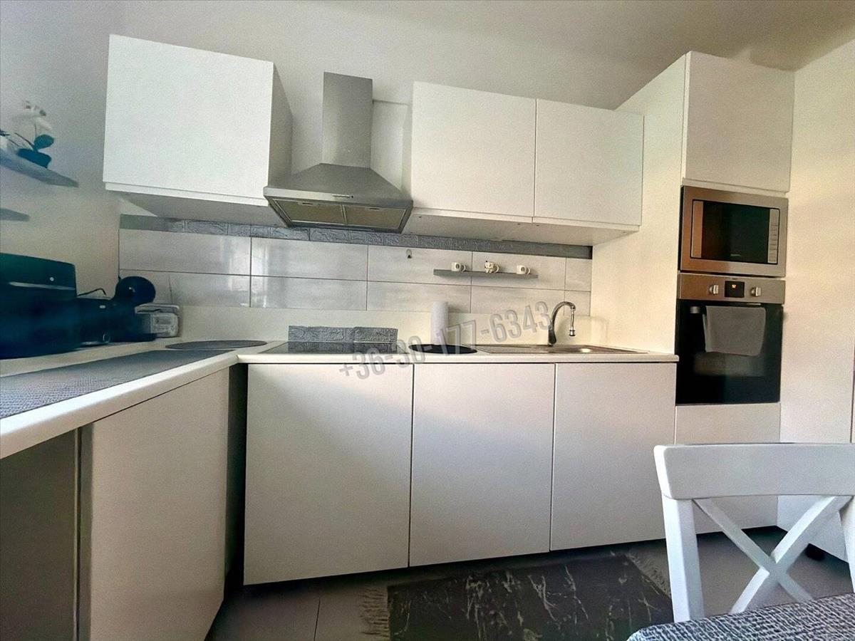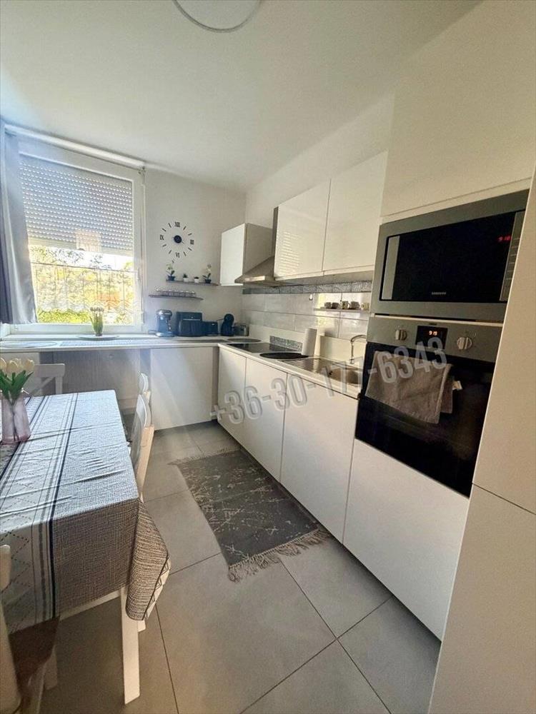 A terek tágasak, a szobák teljes értékűek. Érződik, hogy nem egy 50 m²-es lakásban vagyunk. a konyha is tágas, napos. a modern, fehér konyhabútor beépített konyhagépekkel a vételár része.