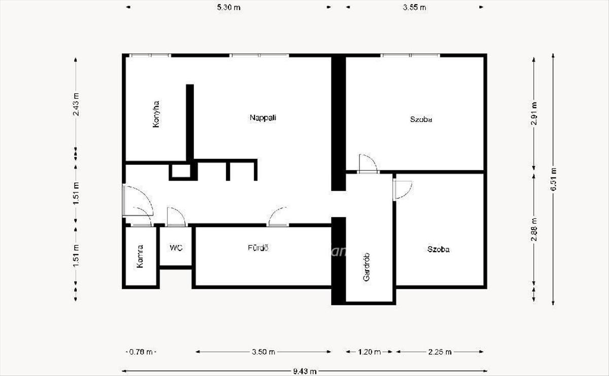 A lakás elrendezése rendkívül praktikus: amerikai konyhás nappali, hálószoba, félszoba (dolgozó vagy gyerekszoba, külön gardrób, kamra, külön wc, fürdőszoba épített mosdóval és sarokkáddal.