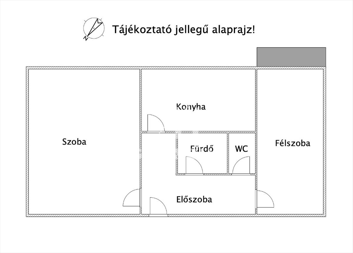 - 1 egész szobából, 1 félszobából, 1 előszobából, 1 konyha/étkezőből, fürdőszobából (zuhanyzós), és 1 különálló WC-ből áll.