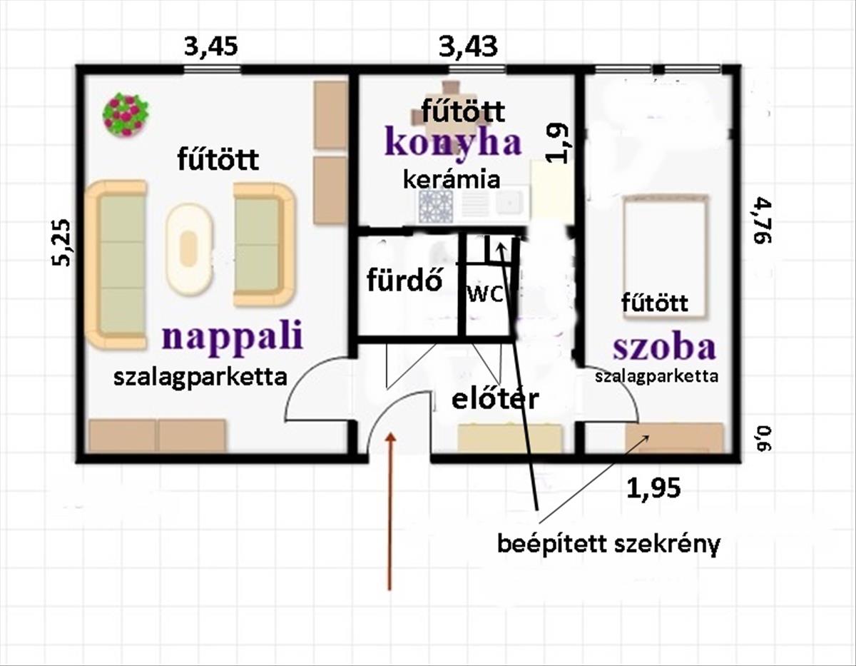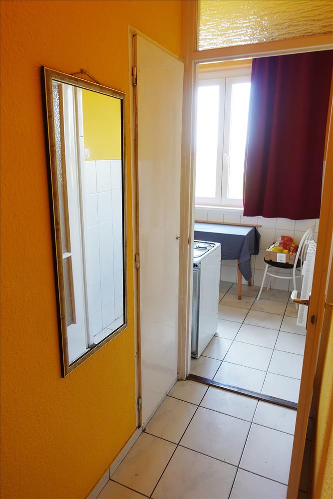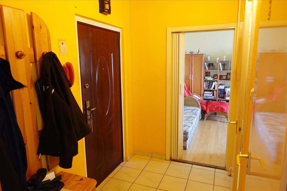 A lakásba belépve egy előtérbe érkezünk. Innen nyílik balra a tágas, világos nappali. a bejárattal szemben a fürdőszoba és a külön wc található. a bejárattól jobbra egy kis közlekedőről nyílik a konyha. a közlekedőben bal oldalt a konyha előtt beépített szekrényt találunk.