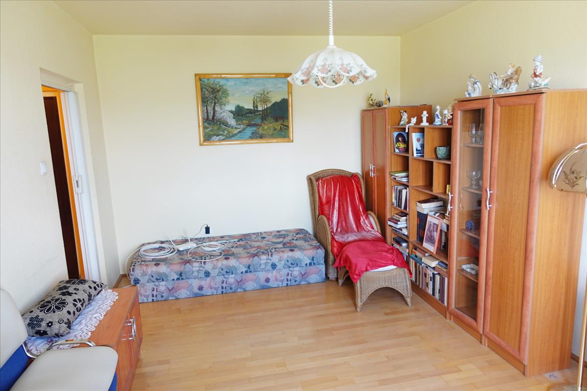 A közlekedő végén, a bejárattól jobbra nyílik a hálószoba. a hálószobában mennyezetig érő beépített szekrény segít a tárolásban. Mind a nappaliból, mind a szobából és a konyhából kinézve valóban magával ragadó panorámában gyönyörködhetünk, amely a veszprémi várra és a Bakonyra néz.