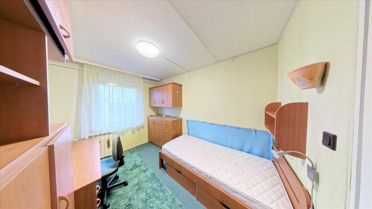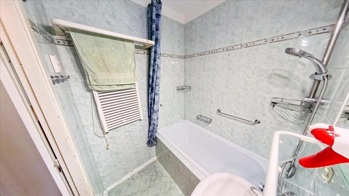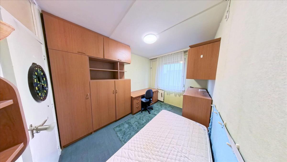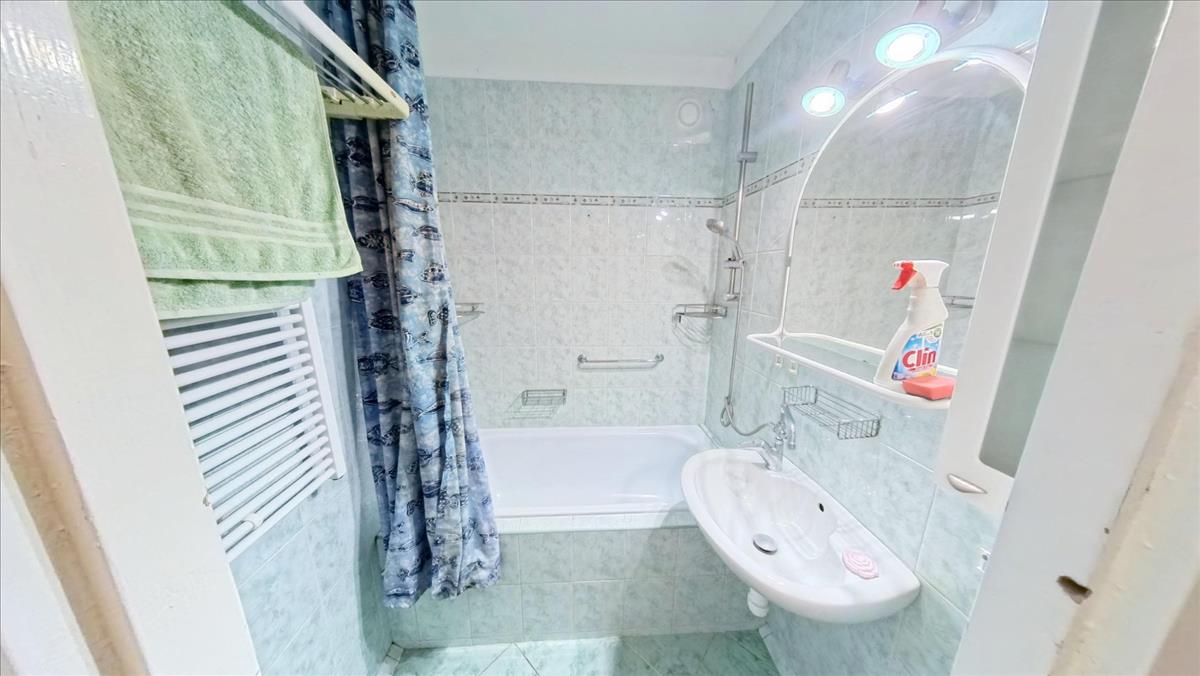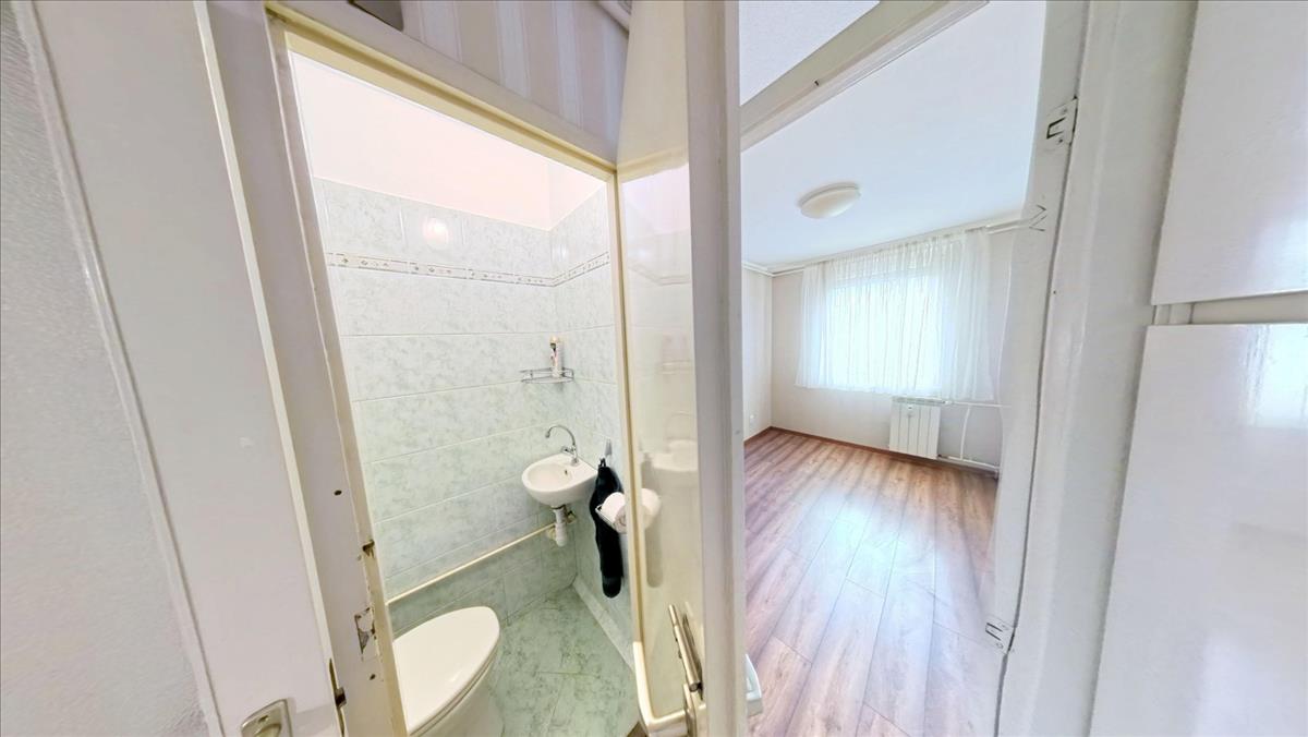 A közlekedőből nyílik a fürdőkádas fürdőszoba. Ebben a közlekedőben is mennyezetig érő beépített szekrény segíti a holmik tárolását. Az ablakokat, az erkélyajtót hőszigetelt műanyag nyílásszárókra cserélték, melyeket alumínium redőnnyel, szúnyoghálóval is elláttak. a nappaliban, 2 hálószobákban laminált lap, 1 hálószobában szőnyegpadló, a konyhában, fürdőben, WC-ben, a közlekedőkben kerámia a padló burkolat.