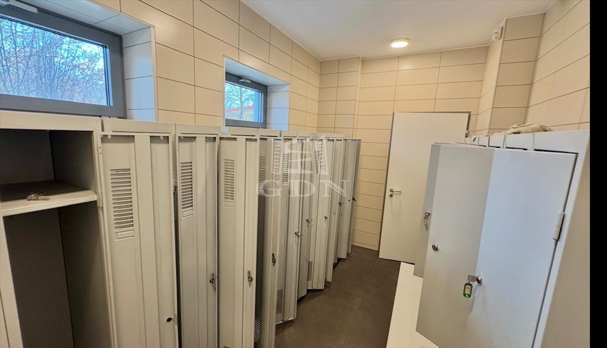 Két szintes szociális blokk, melyen az alsó szinten iroda, 9 főre tervezett öltöző zuhanyzóval és mosdóval, az emeleten pedig gépészeti helyiség és étkező található.