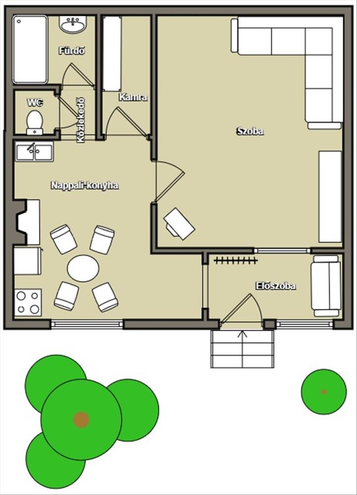 A lakóegység egy előszoba - nappali-konyha - szoba - kamra- fürdőszoba és külön mellékhelyiség részekből áll.