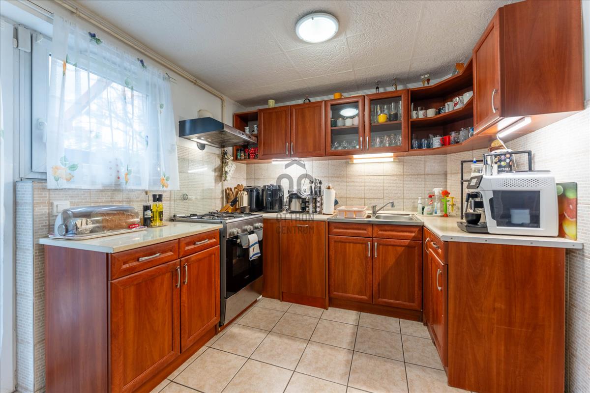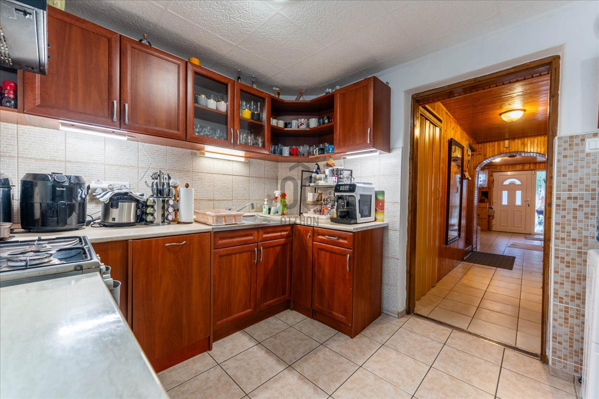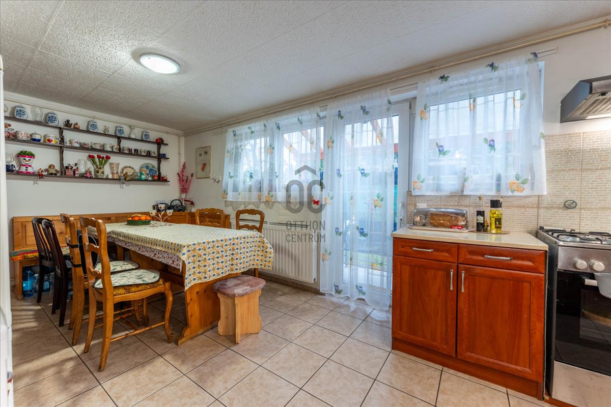 Tágas konyha–étkező, ahonnan közvetlen kijárat nyílik a kertbe, előszoba, kamra és gardrób.