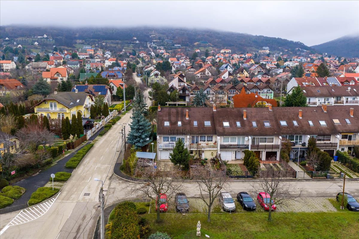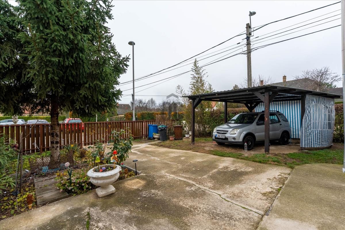 A garázs a lakótérből is közvetlenül megközelíthető. Az udvaron tetővel ellátott felszíni parkoló, sütögetésre alkalmas rész és tároló is található. a sorházzal szemben több közterületi parkolóhely áll rendelkezésre.