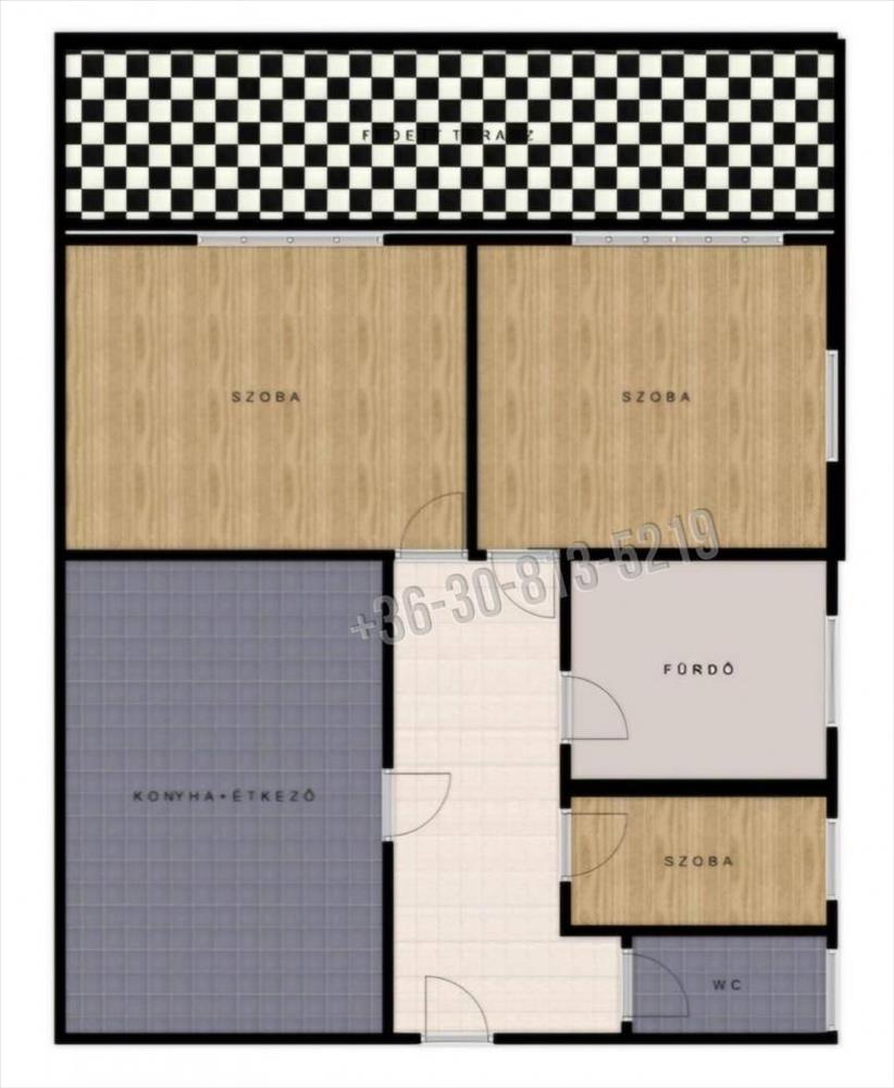 Jelenlegi elrendezése: előszoba, konyha + étkező, fürdőszoba, külön wc, 2 nagy szoba, 1 félszoba (gardróbszoba) valamint egy polikarbonáttal fedett terasz.