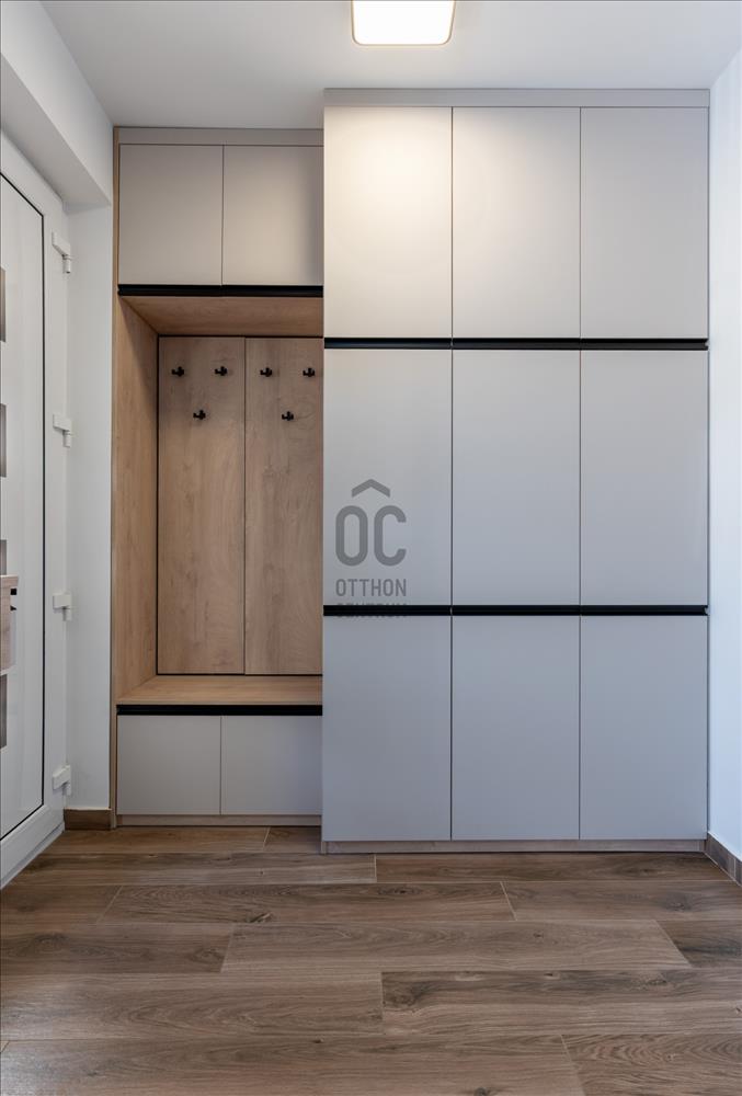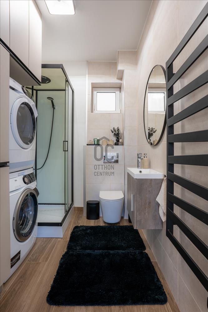 Egy praktikus előszoba fogad beépített tárolókkal, majd egy igényesen kialakított fürdőszoba, amely egyben mosókonyhaként is funkcionál.