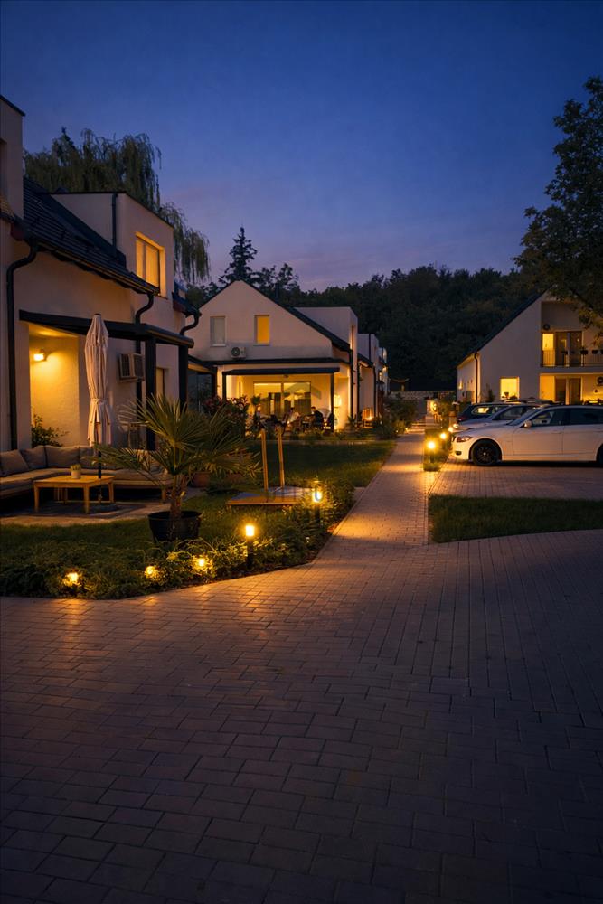A zárt, rendezett lakóparkban mindössze néhány lakás található, saját kertekkel és belső parkolóval – biztonságos, barátságos közeg, ahol jó élni.