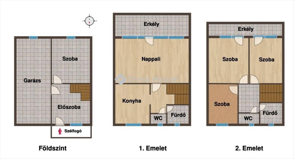 - Földszint: tágas előszoba, háló-/játszószoba, 23 m²-es fűtött garázs