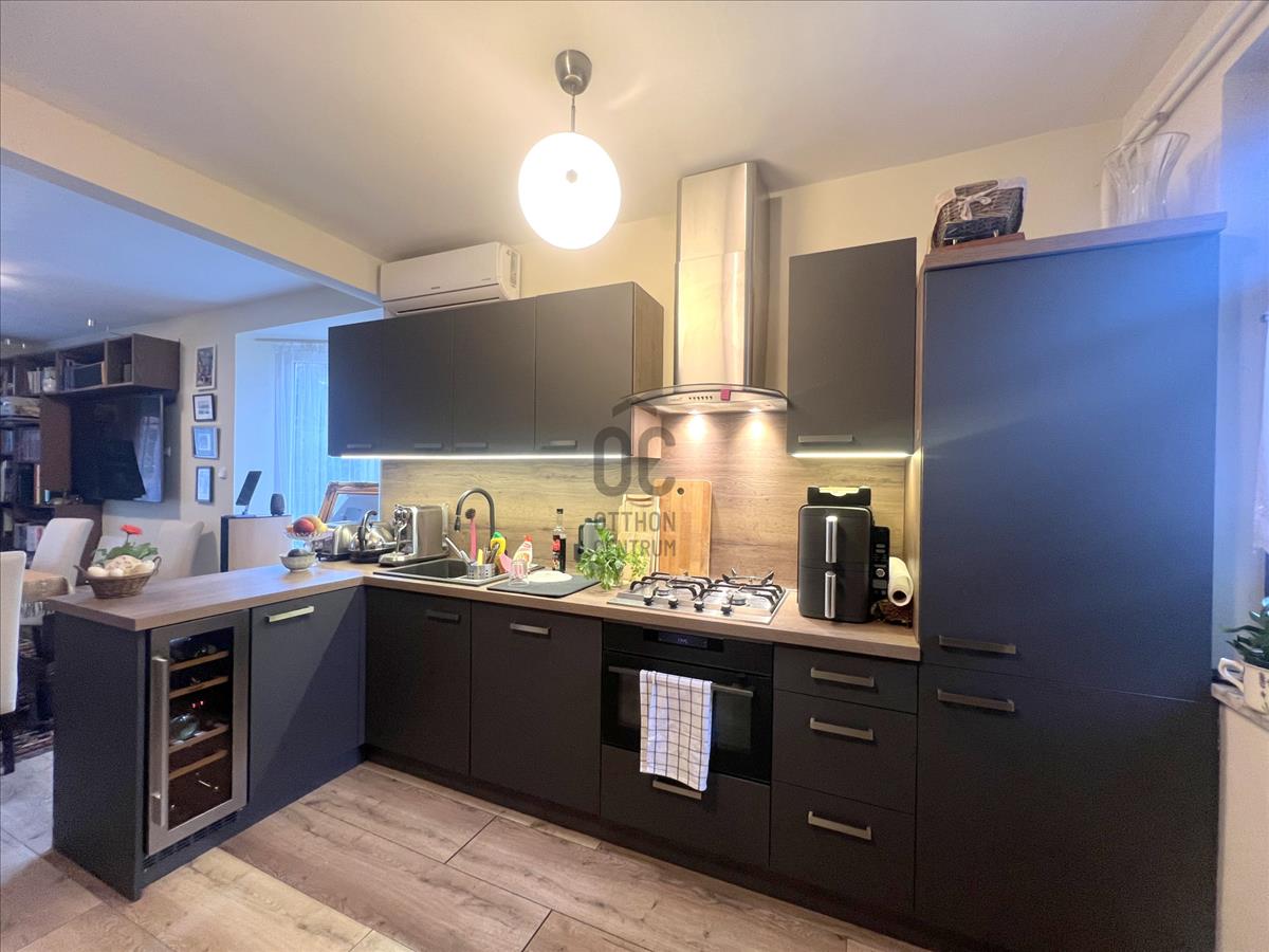 A nappaliban kialakított amerikai konyha minőségi gépekkel felszerelt (Cata, Electrolux, borhűtő, mosogatógép), ideális családi és baráti összejövetelekhez.